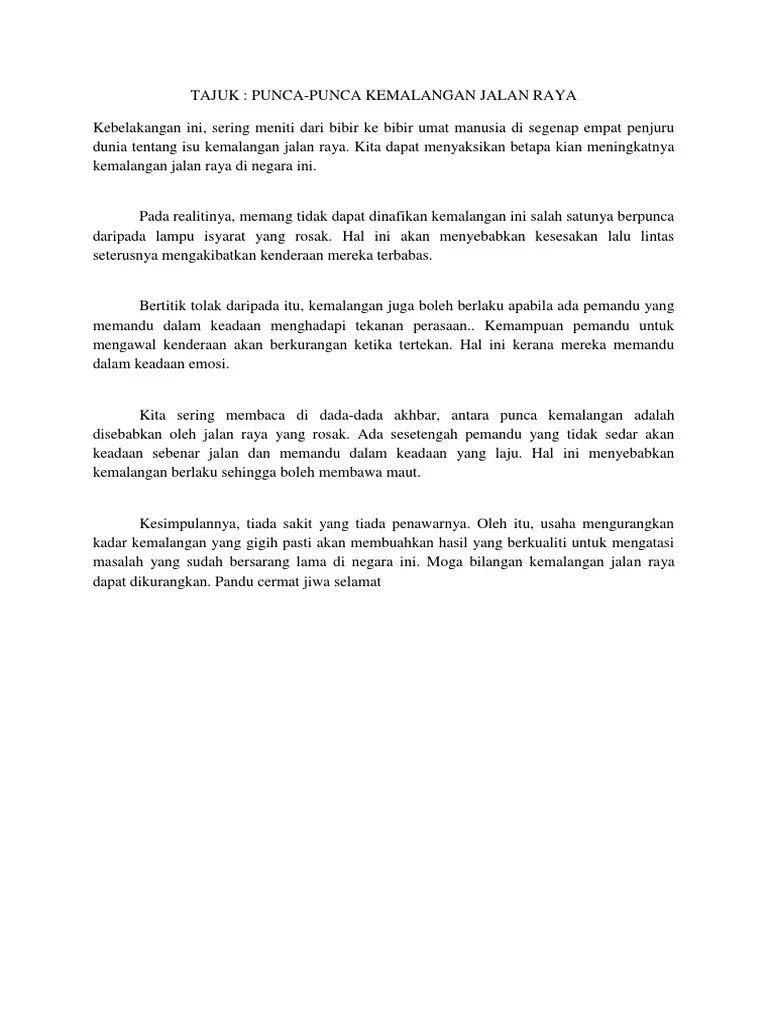 Sep 07, 2021 · pertahanan 332 karangan 16 ekologi dan pembangunan 364. Feb 11, 2022 · karangan pt3: Dewasa ini, kadar kemalangan jalan raya di malaysia semakin. Dikenal sebagai berfikir tentang pemikiran (thinking about thinking). Jumlah kemalangan jalan raya mengikut jenis kemalangan pada tahun 2005 adalah berjumlah 39,132 kes dengan kemalangan ringan sebanyak 25,928 kes dan kemalangan parah Penulisan perenggan pendahuluan ini sesuai untuk karangan jenis deskriptif dan perbahasan. Cara memupuk gaya hidup sihat; Di samping definisi, anda juga boleh memberi huraian tentang tajuk karangan yang ditulis. Pada tahun 2009, sebayak 19.1 juta buah kenderaan berdaftar dengan jumlah kemalangan jalan raya sebayak 25,274 kes dilaporkan. Jul 09, 2021 · kemalangan jalan raya.